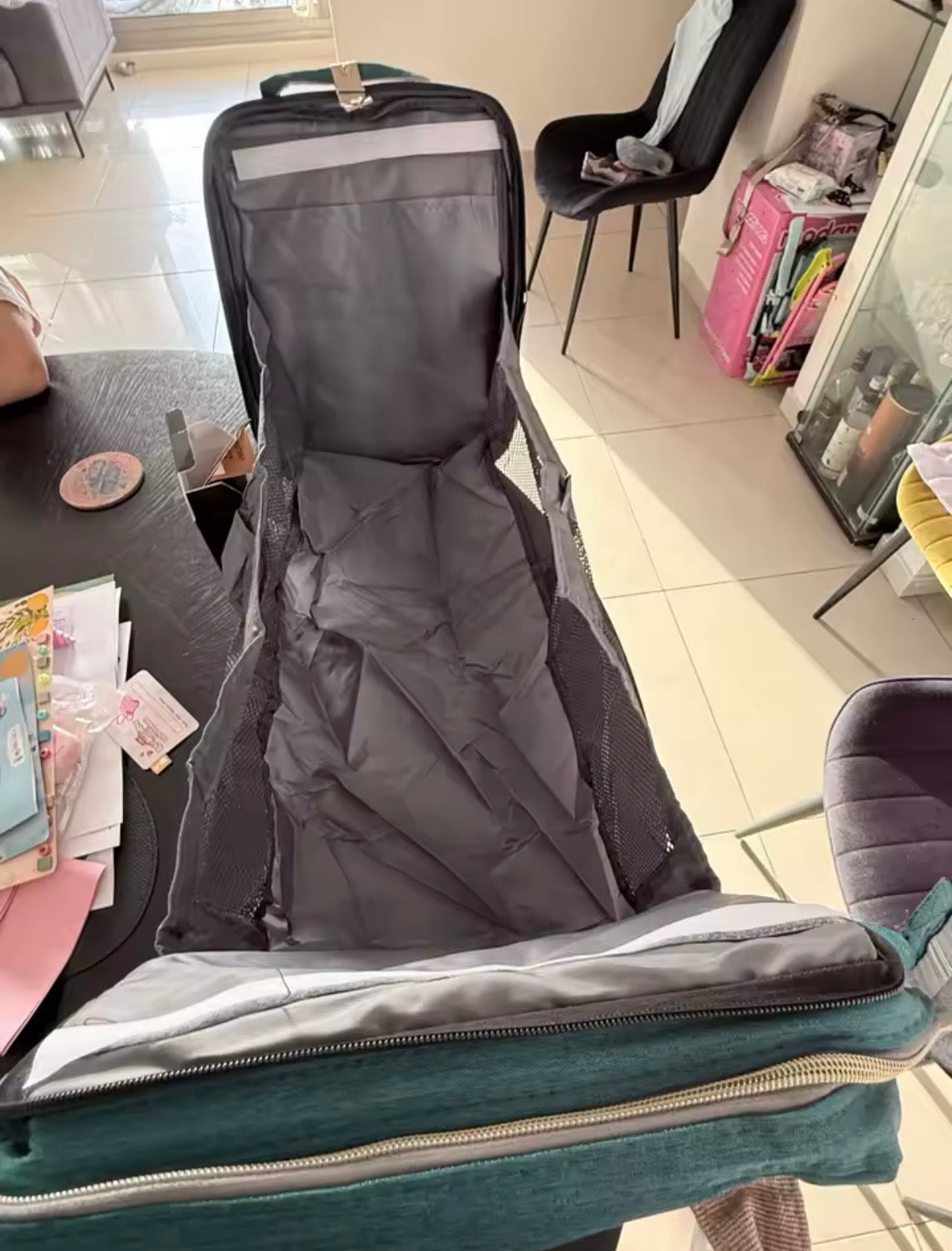 ,,Ich nutze die Tasche eigentlich meistens zuhause im Wohnzimmer, aber letztens im Park hat sie mir extrem geholfen. Keine saubere Fläche und es musste schnell gehen – einfach aufgeklappt und direkt entspannt erledigt."